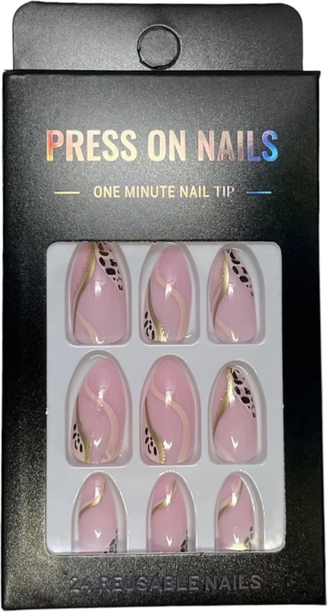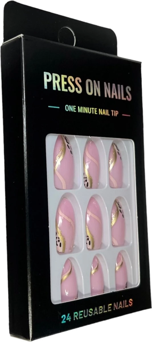 Nepnagels in de kleur Roze met goud. Deze set bevat 24 nagels in 12 verschillende afmetingen. Zo passen ze dus altijd perfect op jouw natuurlijke nagels.