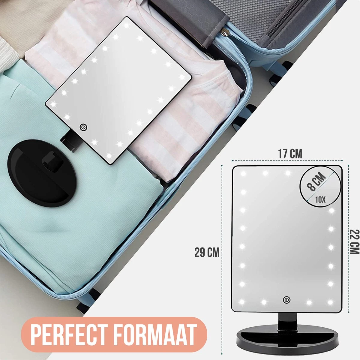 Met een 1x én 10x vergrotende spiegel kun jij kleine details een stuk beter zien. Zo heb je alles wat je nodig hebt voor een strakke eyeliner, smokey eye of mooie lip look en geniet je iedere dag weer van perfecte make-up.