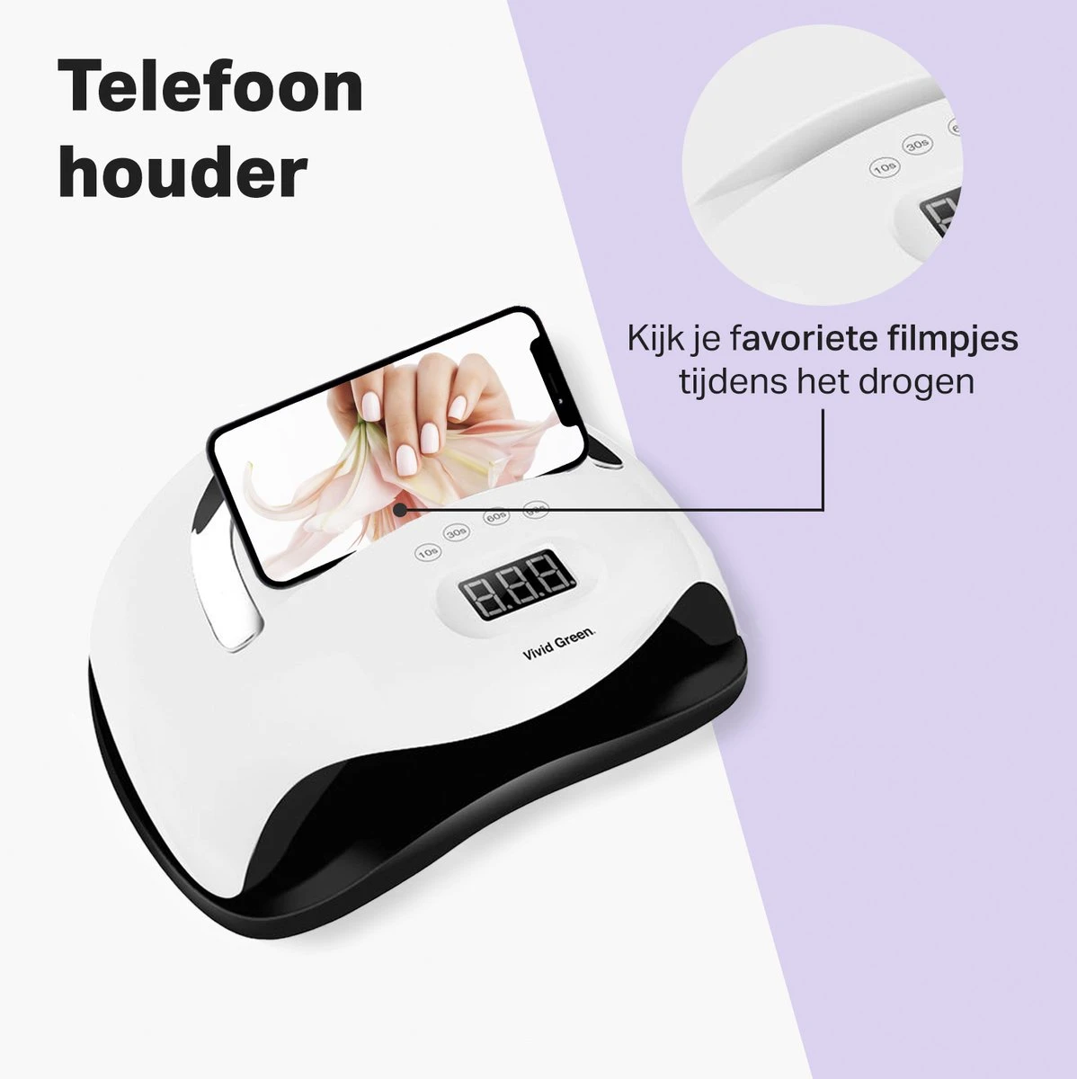 Nog snel even je nagels lakken voordat je weggaat of juist uitgebreid de tijd nemen voor het zetten van de perfecte gelnagels? Dan heb je geen tijd/zin om te moeten wachten tot je nagels eindelijk een keer droog zijn. Met deze Nageldroger is dat probleem eenvoudig opgelost! Binnen no-time zijn jouw nagels droog en zien ze er weer stralend uit. Je hoeft niet meer bang te zijn om je nagels alsnog te beschadigen maar kan gerust de deur uit of verder met je dagelijkse bezigheden. De Nageldroger heeft een krachtige 168W UV Lamp en verschillende timers van 10, 30, 60 en 90 seconden. Als extraatje heeft de Nageldroger een telefoonhouder zodat je heerlijk kan multitasken. Telefoon in de houder, serie aan en voor dat je het weet zijn je nagels alweer klaar!